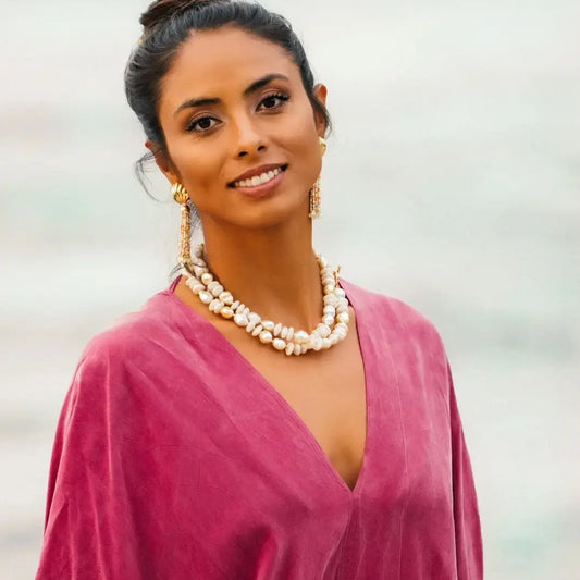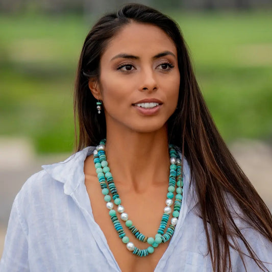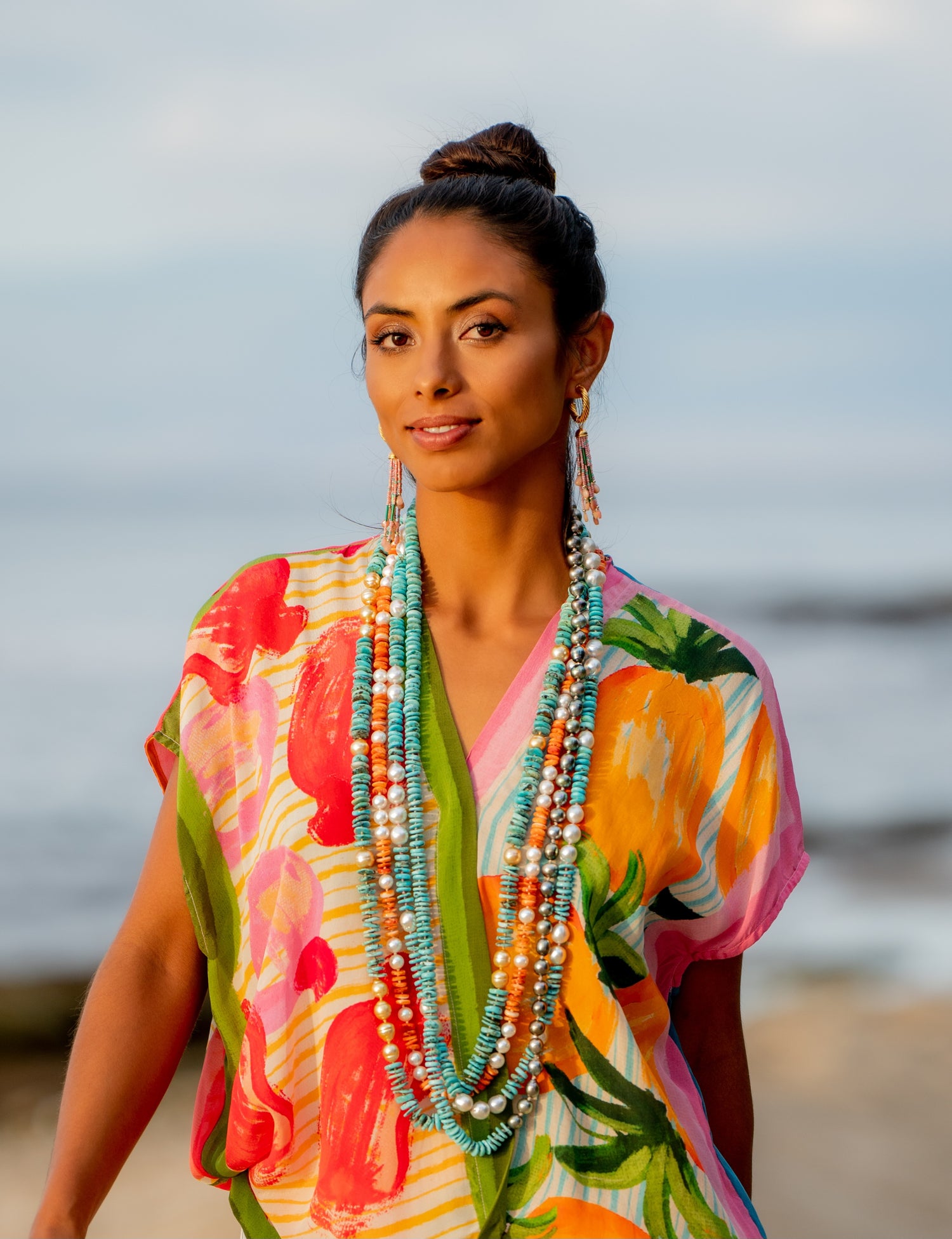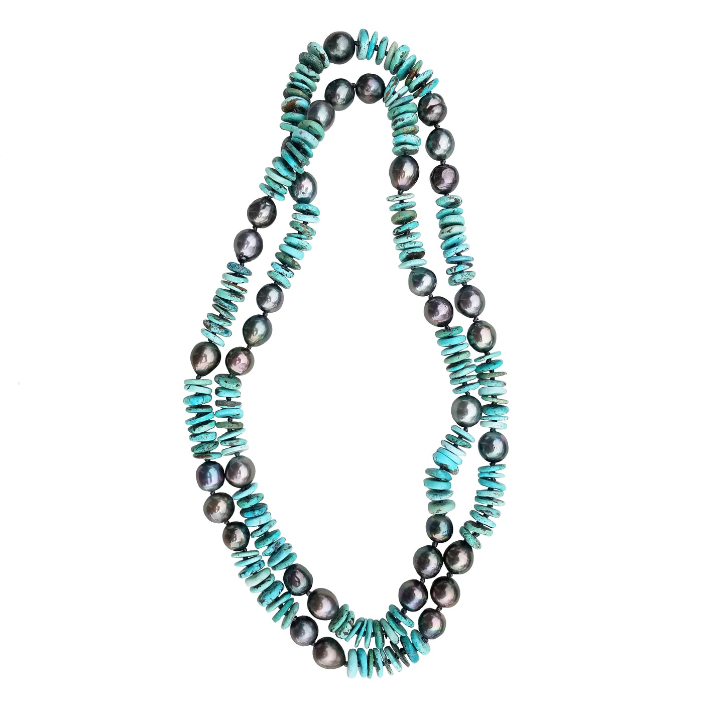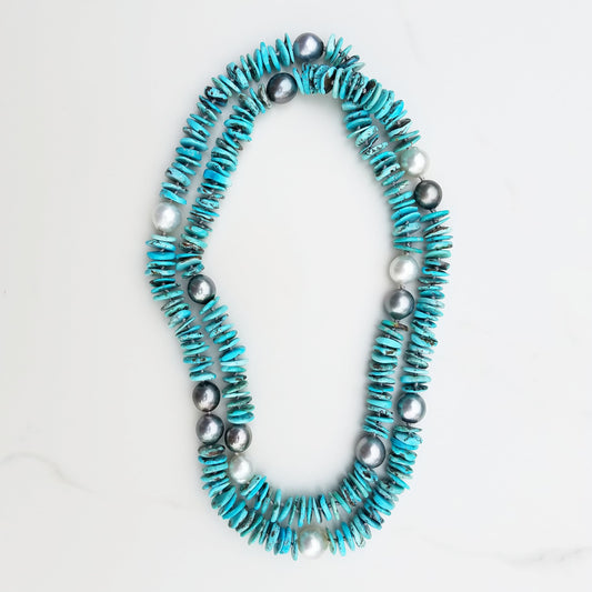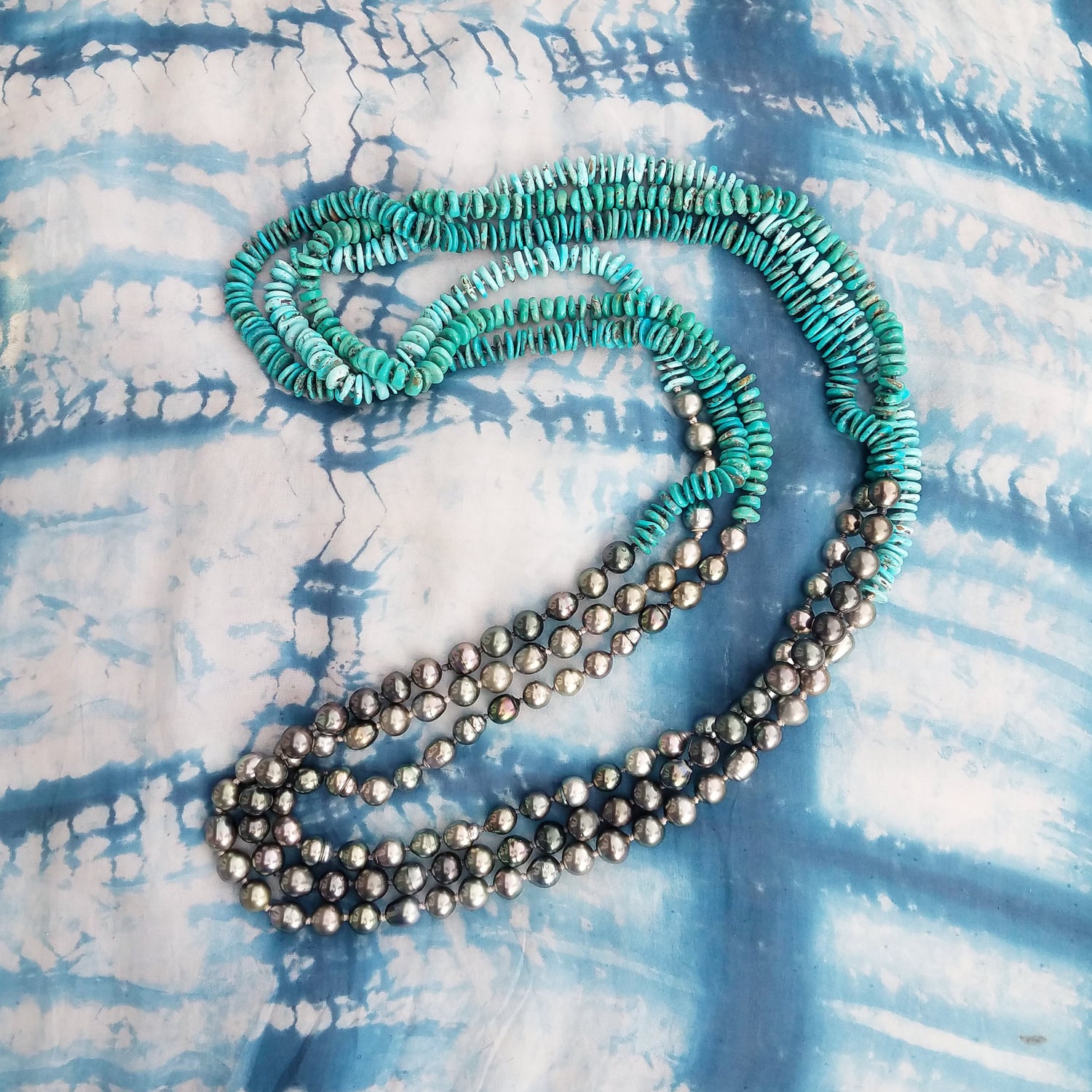 Invoke the beauty of the Islands in a classic Helix Necklace with Pearls & Turquoise. Rich lusters of the deep ocean paired with colors of both sea & sky are the epitome of beach elegance. Pearls are hand selected to accompany their respective shade of Turquoise in these diverse arrangements. Each unique Helix is hand-knotted for flexibility & movement, creating effortless fashion whether you're sea or city bound.